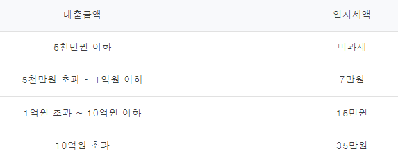 인지세란 대출 계약 신규 약정 시 내는 세금으로 아래와 같이 대출금액에 따라 인지세가 정해지며 5천만원 이하까지는 비과세인 부분이라 신경쓰지 않으셔도 됩니다.