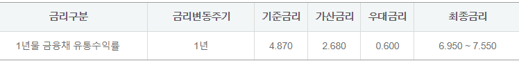 대출금리는 기준금리 + 가산금리를 적용하며 아래와 같습니다.