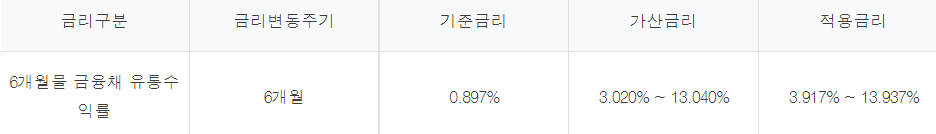대출금리는 최저 연 3.917% ~ 최고 연 13.937%입니다.