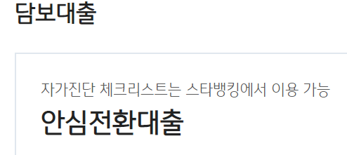 --> 자가진단 체크리스트는 스타뱅킹에서 이용 가능 안심전환대출 가입가능채널 스타뱅킹 기간 최장 30년 상환방법 분할상환 대출한도 최고 2.5억원 ※ 자세한 내용은 아래 상품안내를 참조하시