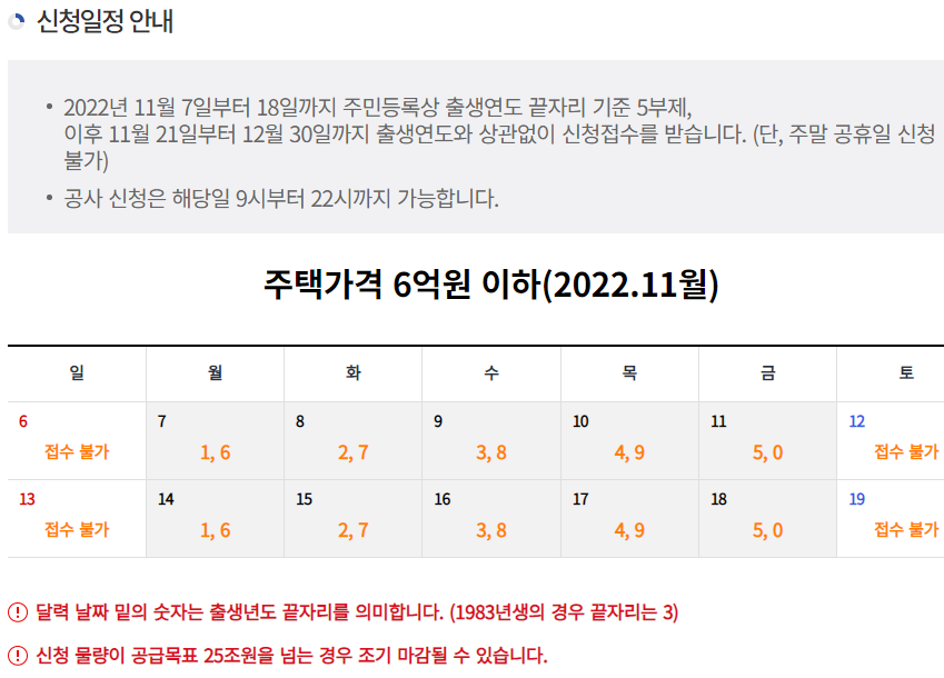 신청은 주택 가격 별 신청기간이 1,2회차로 구분되면 1회차의 경우 주택가격 3억원 이하, 2회차는 주택가격 4억원이하면 신청이 가능합니다.